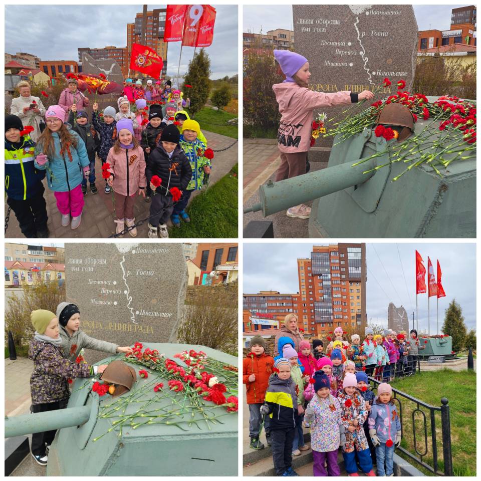 7 мая воспитанники групп «Березка» и «Солнышко» вместе с воспитателями и родителями возложили цветы к Памятнику защитникам Ленинграда (в г. Никольское).