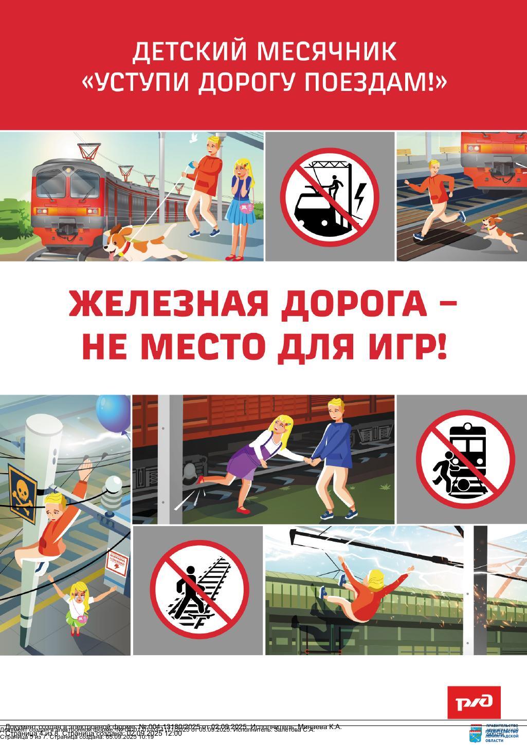 "В целях профилактики детского травматизма на объектах железнодорожной инфраструктуры Ленинградской области информируем о проведении детского месячника "Уступи дорогу поездам" в период с 1 по 30 сентября 2025 г."