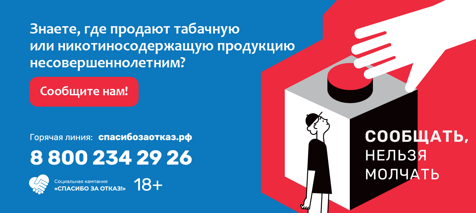 Если вы знаете, где несовершеннолетним продают сигареты или вейпы, сообщите на «горячую линию» 8-800-234-29-26 или пишите через сайт спасибозаотказ.рф